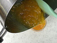 冷めると扱いづらくなるので、熱いうちに密封できる耐熱容器に流し入れます。長期保存をする場合は、瓶の9分目まで詰めます。瓶の口をきれいにしてから蓋を閉め、空気を逃がすために10分くらい逆さまにして置きます。そのあと元に戻してゆっくり冷ましてください。 |