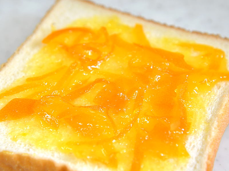 濃厚な金柑マーマレードの完成です。さっそくパンに塗って食べました。口当たりの良い果肉のソースと、ほろ苦い皮の触感。何枚でも食べれそうです。 |