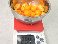 種を取り除いたら、重さを量って40%の砂糖を用意します。(294g×40%=118g)カビを防ぎ常温で1年以上保存する場合、糖度は60~65%以上必要になるようですが、今回は少量だったので、冷蔵庫で2週間くらいで食べ切る予定で、低糖度の40%で作りました。 |