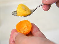 スプーンを皮と果肉の間に差し込み、皮に沿ってスプーンを回して、果肉を取り出します。 |
