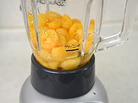 取り外した果肉をミキサーに入れます。このままだとミキサーが回らないので、少量の水を加えて攪拌します。 |