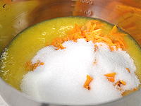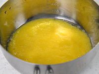果肉が入っている鍋に、刻んだ皮と砂糖を加え、中火で加熱します。水分が少なくなってくると、跳ねやすく焦げ付きやすくなるので、弱火に落として煮詰めてください。 |