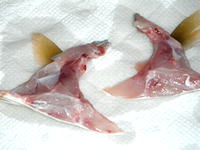 胸ヒレと腹ヒレの後ろ側を包丁が通るように切ります。 |