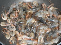 酒を加え、蓋をして海老が赤くなるまで蒸します。蒸し上がったら塩を加え味を整えます。 |