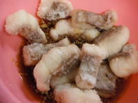 キッチンペーパーで余分な水分を拭き取ります。片栗粉を適量入れたビニール袋に、水分を拭き取ったムキサメを投入し、シャカシャカと振って片栗粉をよくまぶします。 |