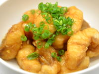 ムキサメをから揚げにした後、ポン酢タレを絡めました。