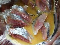 予め混ぜ合わせておいた酢味噌に、そぎ切りにしたニシンを加え絡ませます。 |
