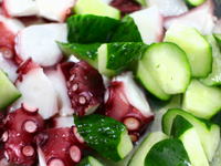 胡瓜とタコをお好みの形に切り、バジルソースで和えます。 |
