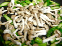 バターが溶けたら切っておいたアスパラと、石づきを取ったぶなしめしを加え炒めます。バターが全体に回ったら、醤油とすりおろしにんにくを加え、最後にコショウで味を整えます。 |