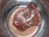 その後、2~30分放置する事で、血抜きすることができます。写真は血抜きの終わった豚レバーを水で洗おうとしているところです。 |