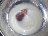 水洗いが終わったレバーは牛乳に浸して置きます。時間は5時間ぐらいとしました。これでレバーの臭みをとる効果があるそうです。 写真は分かり安いように牛乳からレバーが出ていますが、本当は全部隠れるぐらい浸しています。 |