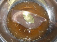 牛乳から取り出したレバーは水でよく洗った後、ソミュール液に漬け込みます。このとき、ローリエとローズマリーも一緒に漬け込みます。 |