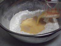 粉の中央を窪ませて水溶き卵とドライイーストを入れ、イーストと水を馴染ませながら、周りの粉を少しずつ混ぜ合わせていきます。軽量カップに卵1個と水を入れ、190㏄になるようにしてから、卵を溶いておきます。 |