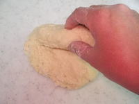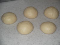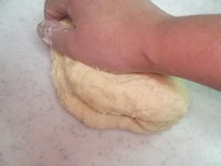 20分後、5個の生地を手で12~15センチくらいの大きさまで潰しながら伸ばします。 |
