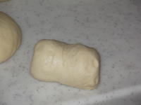 ガス抜きをした生地を、包丁やスケッパーなどを使って、生地が傷まないように個数分切り分けます。切り分けた生地を、手のひらで包むようにしながら台の上で転がして丸めます。今回は5個に切り分けました。 |