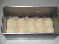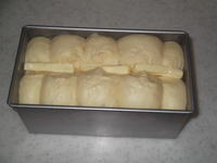 バターを塗っておいた型に、継ぎ目を下にして5個並べてセットし、オーブンの発酵機能を使って発酵させました。37℃で50分発酵させました。25度前後の室温で発酵させる場合は、だいたい1時間くらい発酵させます。発酵が終わったらオーブンから取り出し、オーブンを予熱させます。予熱させている間、生地が乾燥しないようにサランラップや蓋などを被せておきます。 |