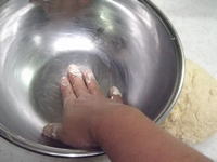 発酵させた生地に、粉をつけた指で生地を押し付けてみます。写真の様に押した穴がそのままの状態を保っていれば一次発酵は終了です。穴がふさがる様だと発酵不足、生地自体が萎んでしまえば発酵のしすぎだそうです。 |