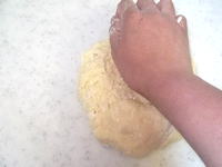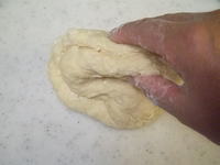 押し伸ばした生地を、前と同じように半分に折り畳みます。これを50回くらい繰り返し、生地を捏ねます。 |