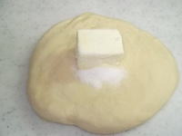 生地が滑らかになってきたら、生地の中央に室温に戻しておいたバターと塩を入れ、更に100回捏ねます。バターを入れると一時的に生地のまとまりがなくなりますが、捏ねているうち馴染んできます。 |
