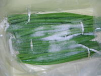 ミズナは皮を剥き、たっぷりのお湯で色が変わる程度、軽く茹でます。ミズナが鮮やかな緑色に変わったら、すぐに冷水に浸け冷やします。ミズナが冷えたら一握りくらいずつの束にします。束にしておくと取り出すときに便利です。 |