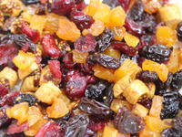 ドライフルーツを少し柔らかくするために、ラム酒やキルシュ、ブランデーなどをふりかけ、ラップをかけずに500Wのレンジで2分加熱します。加熱し終わったらレンジから取り出し、かき混ぜてそのまま冷まします。お酒が苦手の方は水でいいです。今回使ったドライフルーツは、レーズン、クランベリー、アプリコット、イチジクです。 |