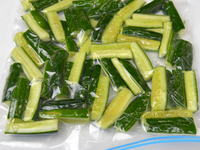 キュウリの両端を落とし、重さを量って塩の分量を決めます。測り終わったら、キュウリを紫蘇の葉で巻けるくらいの幅で切り分けます。さらに、縦に4等分にして保存袋に入れます。 |
