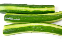 きゅうりの両端を切り落とし、味が染み込みやすいように、2~3ヵ所、ピーラーで皮を剥きます。 |