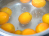 沸騰したお湯に金柑を入れて、1分から2分程度茹でます。茹でると苦味が薄れ、種も取れやすくなります。 |